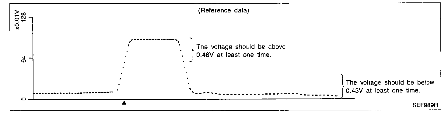 5. Check the voltage when revving up to 6,000 rpm under no load. Or keep vehicle at idling for 10 minutes, then check the voltage. Or check the voltage when coasting from 80 KPH (50 MPH) in 3rd gear position (M/T), D position with "OD" OFF (A/T). The voltage should be below 0.43 V at least once.