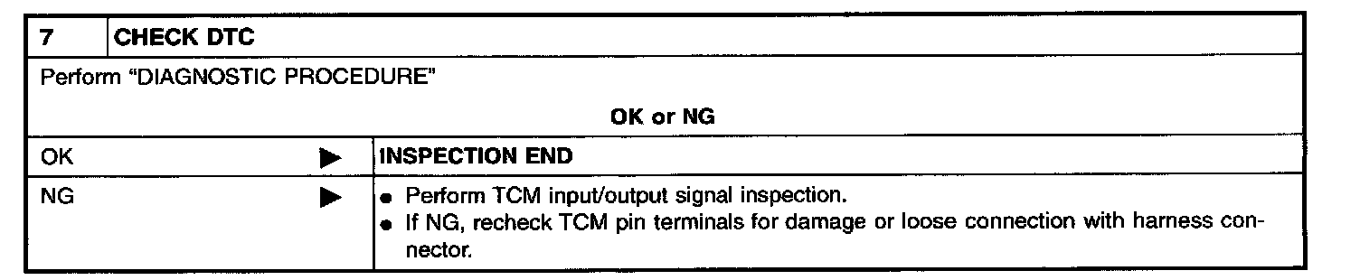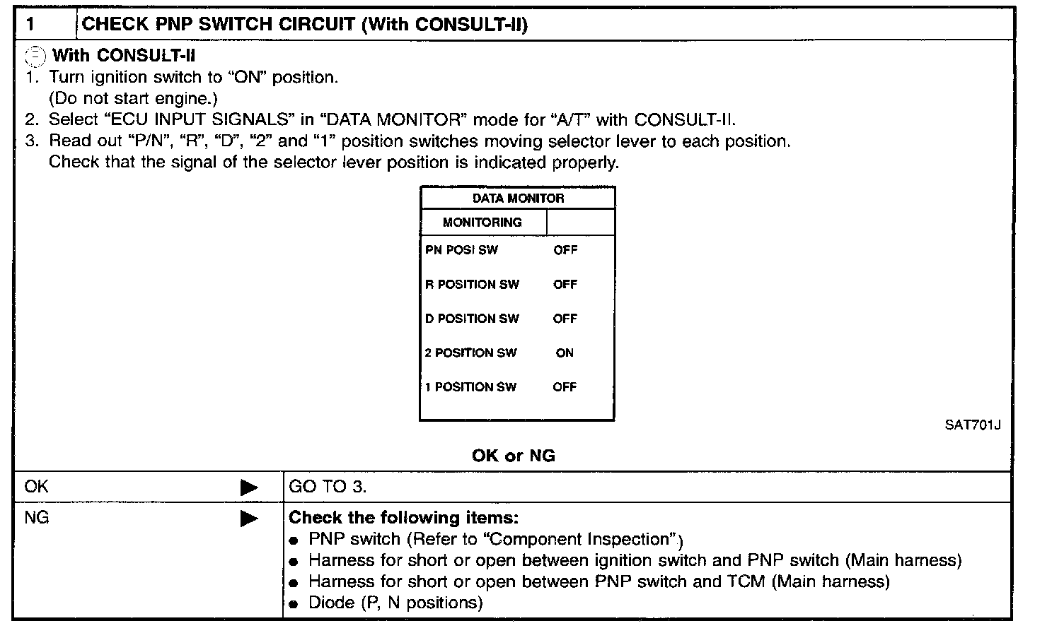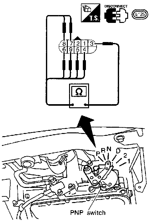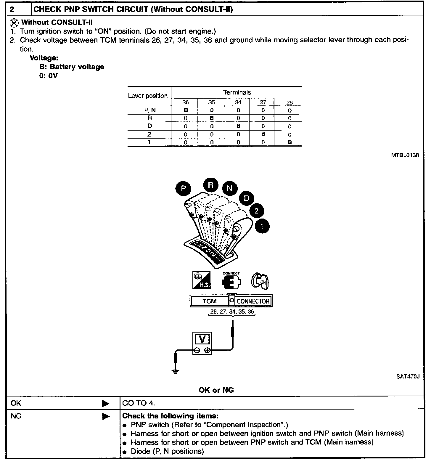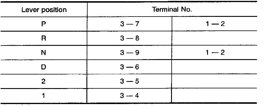 4. If NG on step 2, remove PNP switch from A/T and check continuity of PNP switch terminals. Refer to step 1.