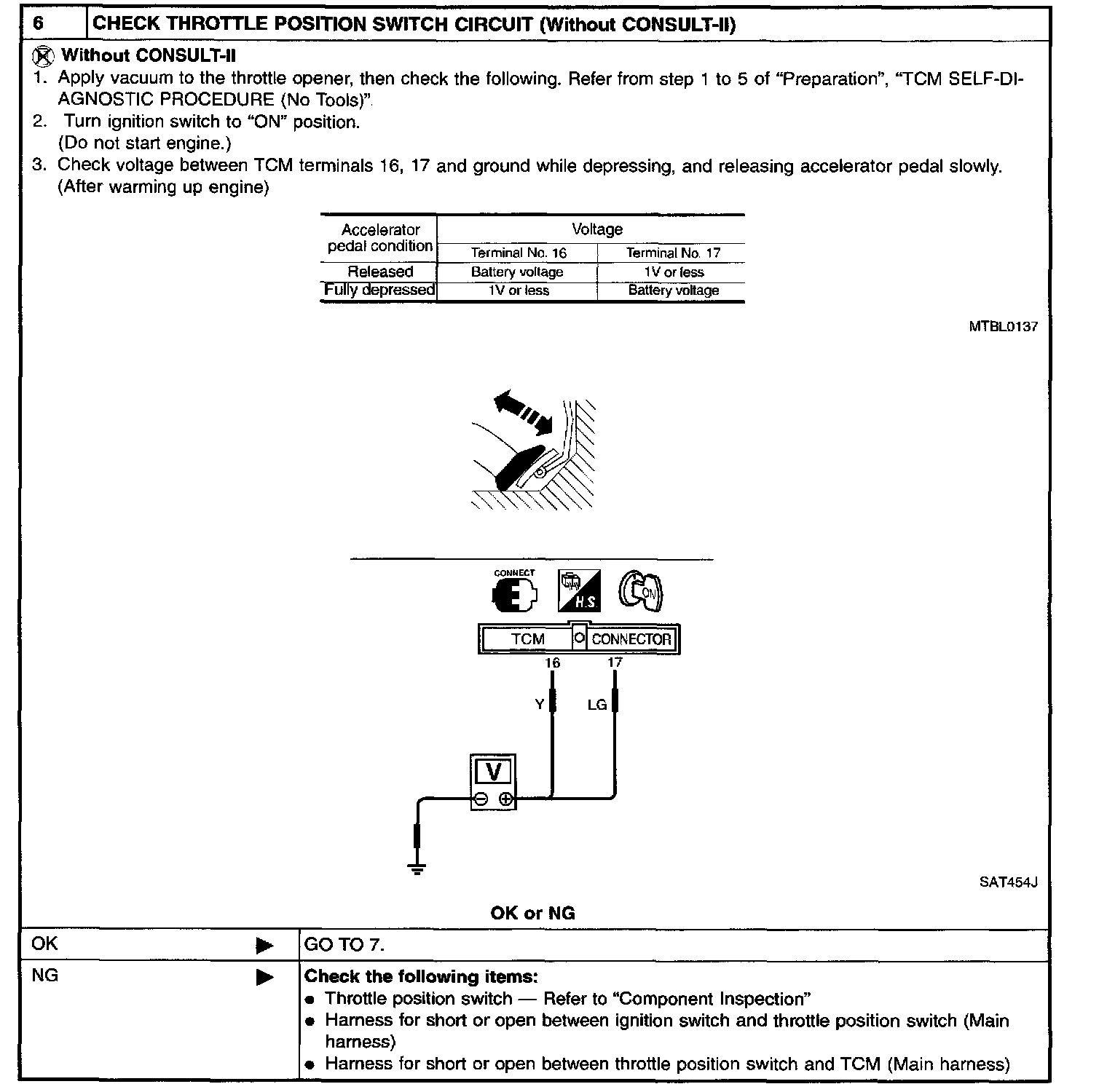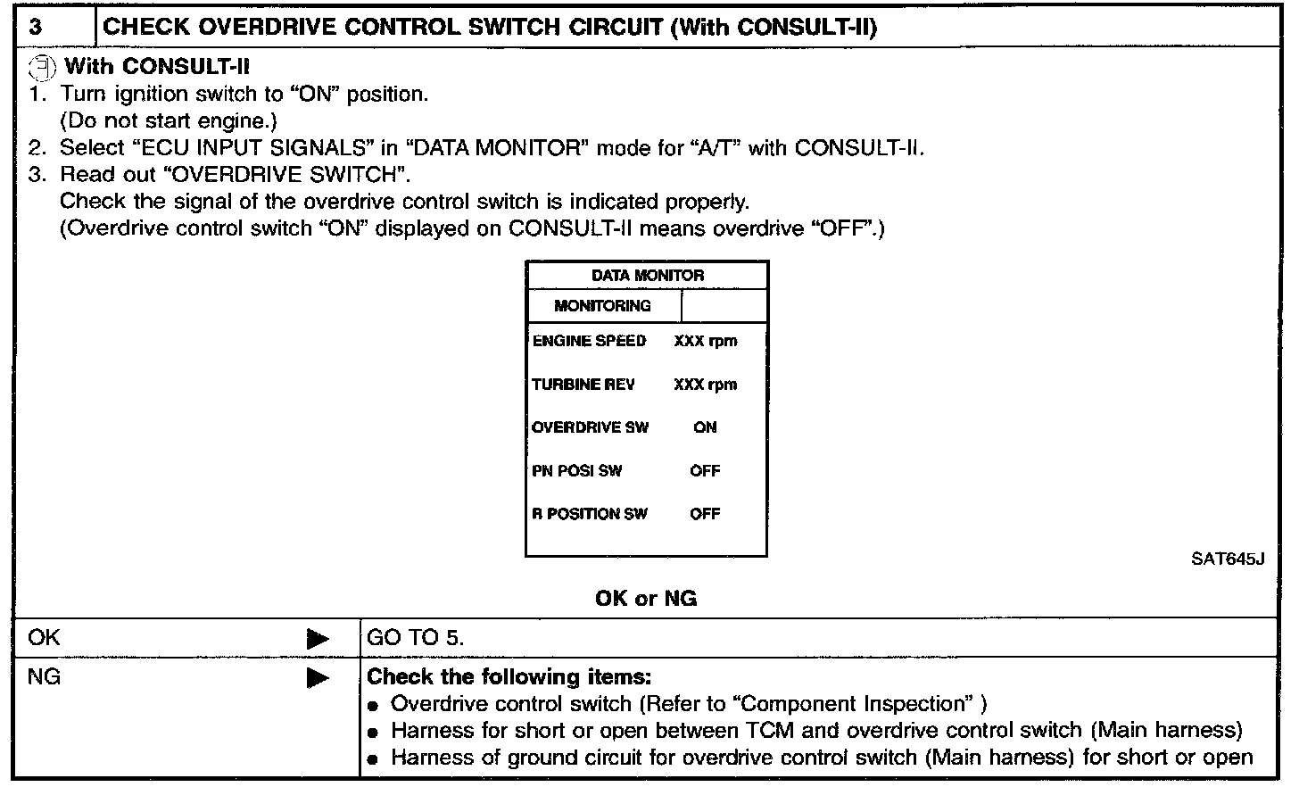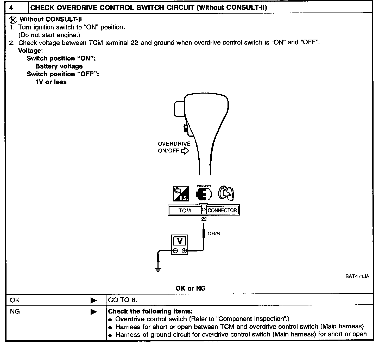 21. TCM Self-diagnosis Does Not Activate (PNP, Overdrive Control and Throttle Position Switches Circuit Checks)SYMPTOM: O/D OFF indicator lamp does not come on in TCM self-diagnostic procedure even if the lamp circuit is good.