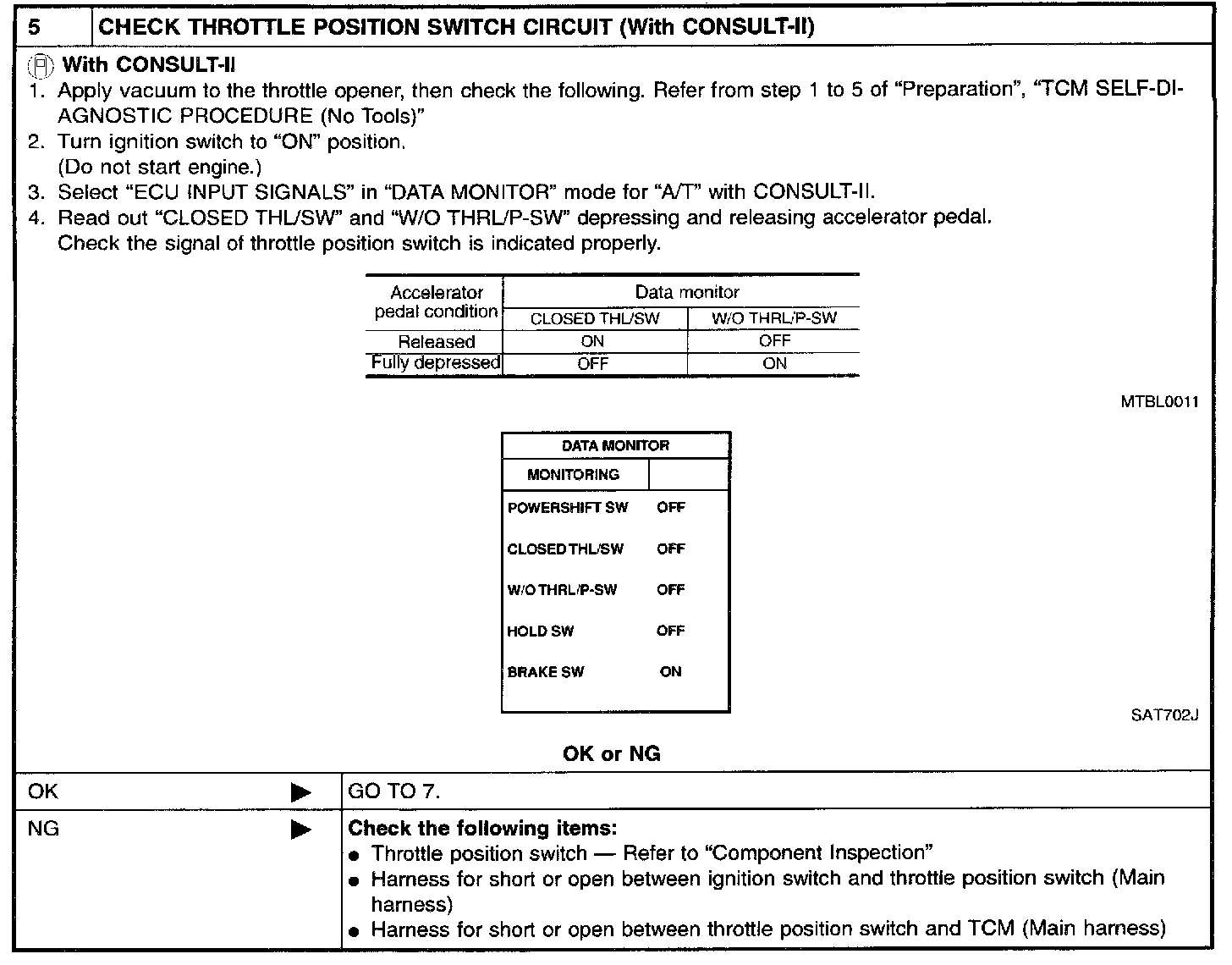 Consists of a wide open throttle position switch and a closed throttle position switch. The wide open throttle position switch sends a signal to the TCM when the throttle valve is open at least 1/2 of the full throttle position. The closed throttle position switch sends a signal to the TCM when the throttle valve is fully closed.