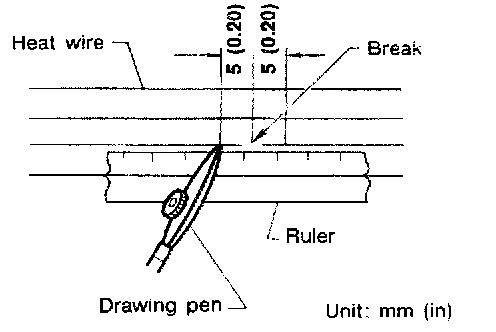 3. Place ruler on glass along broken line. Deposit conductive silver composition on break with drawing pen. Slightly overlap existing heat wire on both sides [preferably 5 mm (0.20 in)] of the break.