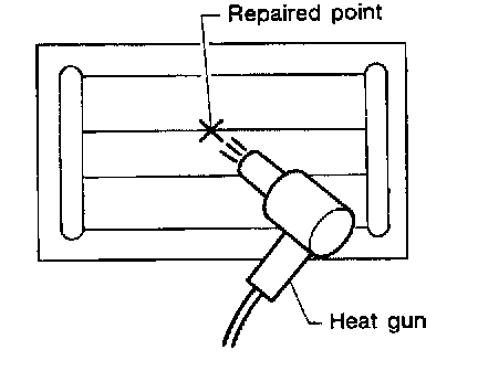 5. Apply a constant stream of hot air directly to the repaired area for approximately 20 minutes with a heat gun. A minimum distance of 3 cm (1.2 in) should be kept between repaired area and hot air outlet. If a heat gun is not available, let the repaired area dry for 24 hours.