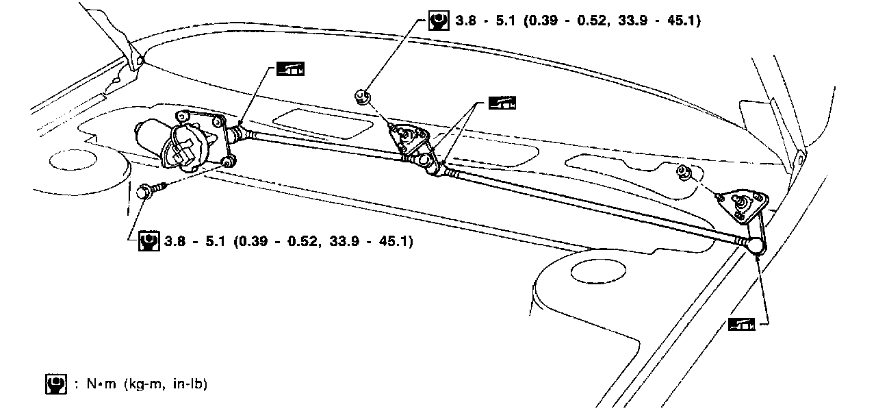 Front wiper: 17 - 23 Nm (1.7 - 2.3 kg.m, 12 - 17 ft-lb)