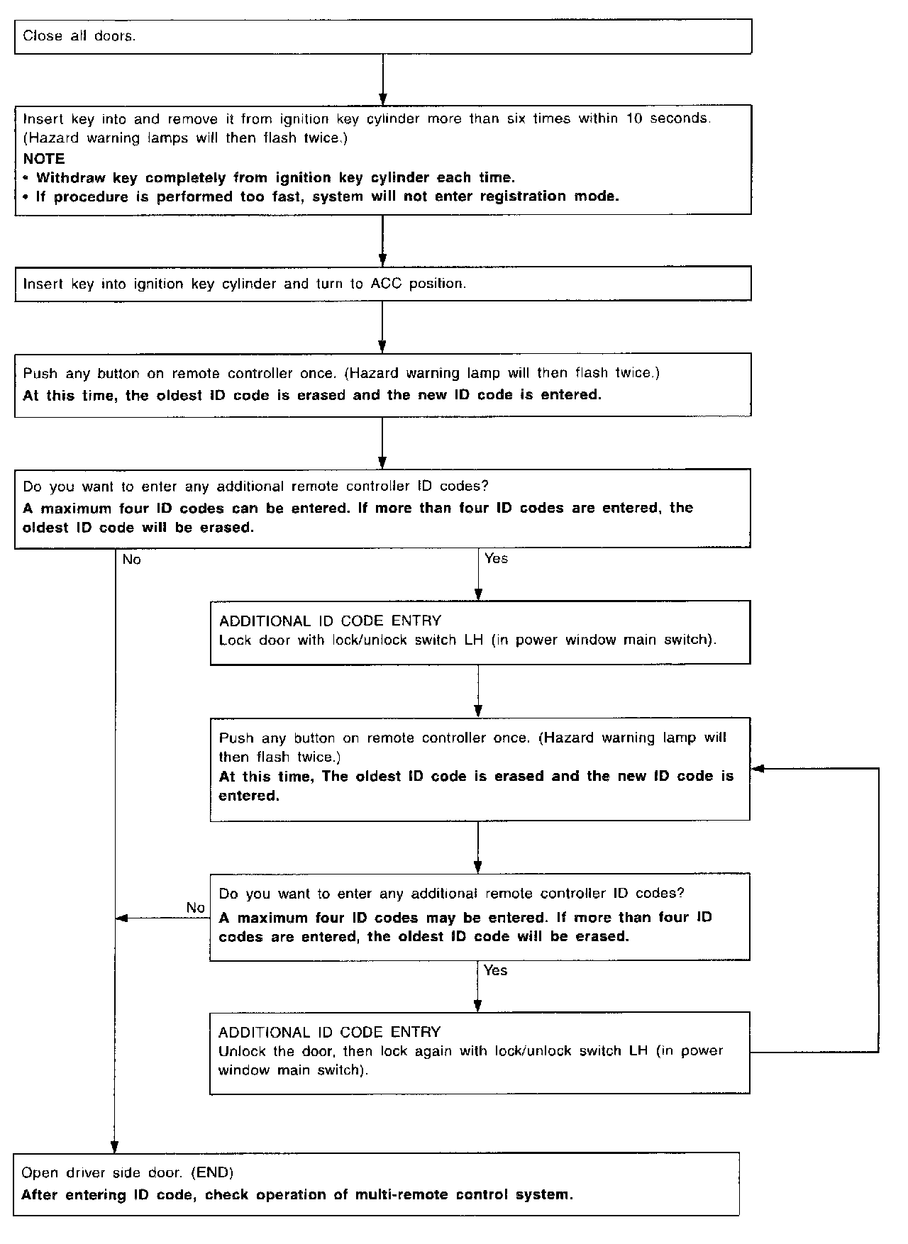 - If a remote controller is lost, the ID code of the lost remote controller must be erased to prevent unauthorized use. A specific ID code can be erased with CONSULT. However, when the ID code of a lost remote controller is not known, all controller ID codes should be erased. After all ID codes are erased, the ID codes of all remaining and/or new remote controllers must be re-registered.