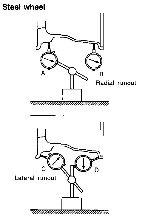 d. Rotate wheel and check dial indicators at several points around the circumference of the wheel.