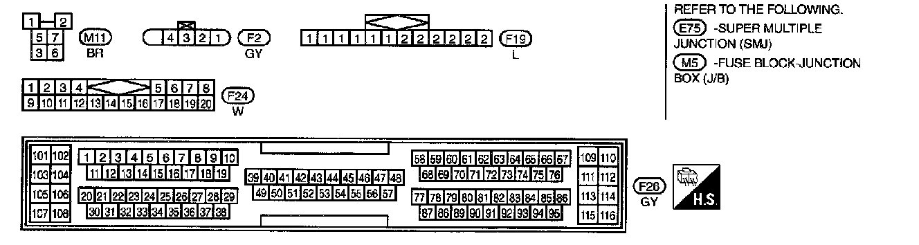 Fuse Block - Junction Box (J/B) Terminal Arrangement (B1, E71, E72, E73, M1, M2, M3, M4, M5):