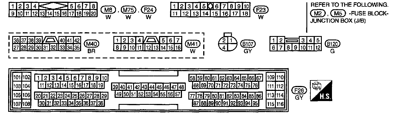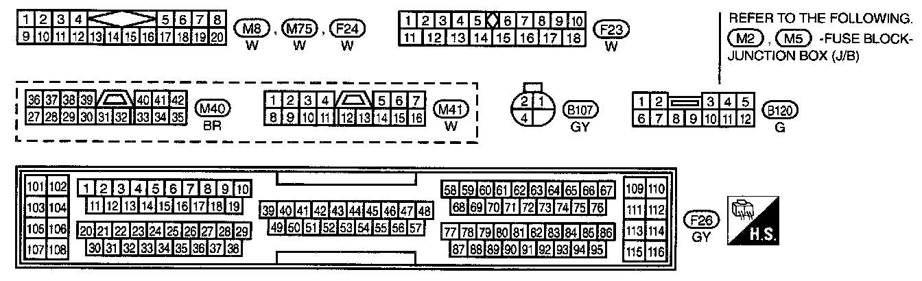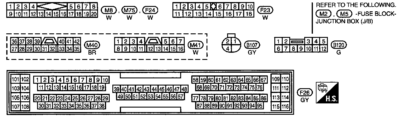 Fuse Block - Junction Box (J/B) Terminal Arrangement (B1, E71, E72, E73, M1, M2, M3, M4, M5):