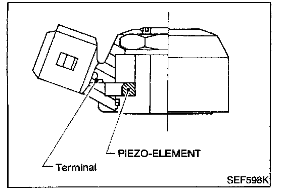 The knock sensor is attached to the cylinder block. It senses engine knocking using a piezoelectric element. A knocking vibration from the cylinder block is sensed as vibrational pressure. This pressure is converted into a voltage signal and sent to the ECM.