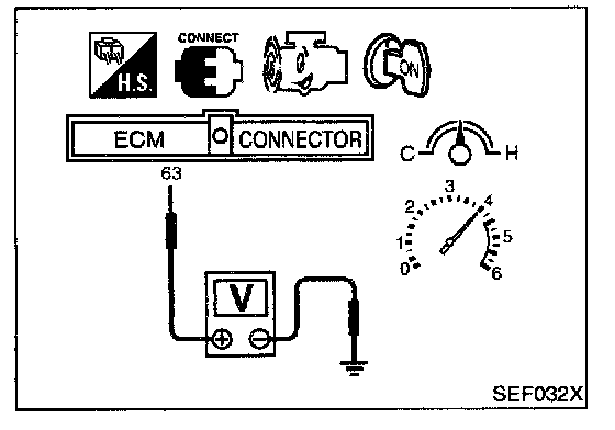 3. Set voltmeter probes between ECM terminals 63 [Heated oxygen sensor 2 (rear) signal] and engine ground.