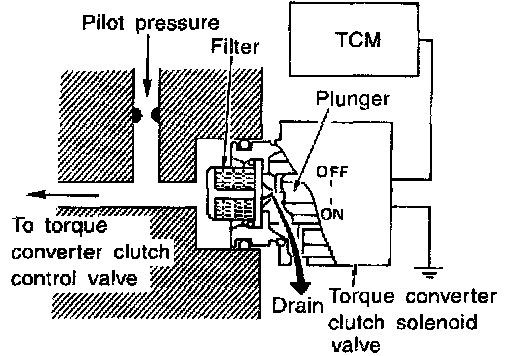 The torque converter clutch solenoid valve is controlled by the TCM. The plunger closes the drain circuit during the "OFF" period, and opens the circuit during the "ON" period. If the percentage of OFF-time increases in one cycle, the pilot pressure drain time is reduced and pilot pressure remains high.