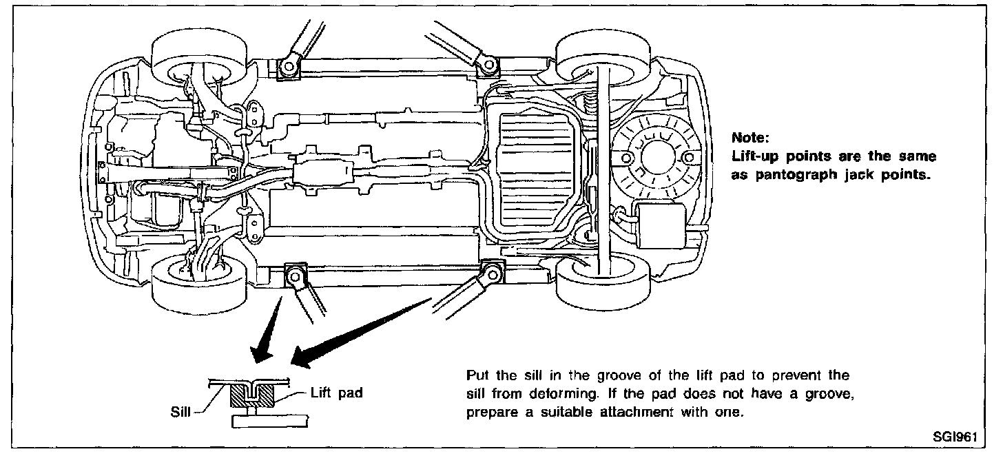 When lifting the vehicle, open the lift arms as wide as possible and ensure that the front and rear of the vehicle are well balanced.