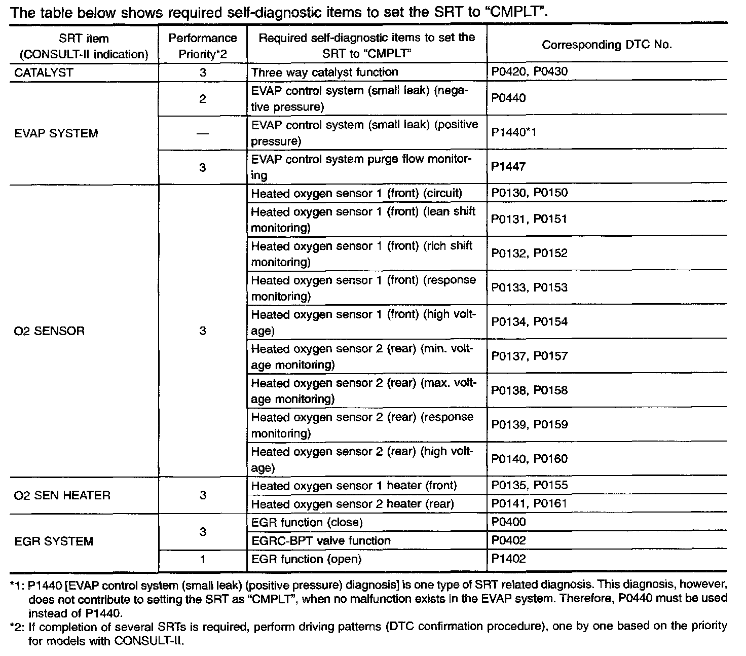 To set all SRT codes, self-diagnosis for the items indicated must be performed one or more times. Each diagnosis may require a long period of actual driving under various conditions.