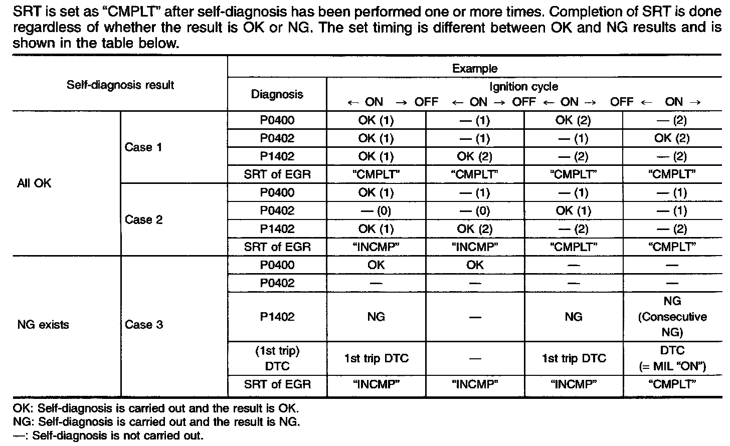 The table shows that the minimum number of cycles for setting SRT as "INCMP" is one (1) for each self-diagnosis (Case 1 & 2) or two (2) for one of self-diagnoses (Case 3). However, in preparation for the state emissions inspection, it is unnecessary of each self-diagnosis to be executed twice (Case 3) for the following reasons:
