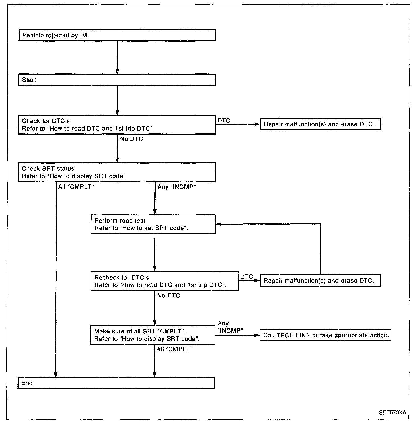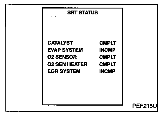 If, during the state emissions inspection, the SRT indicates "CMPLT" for all test items, the inspector will continue with the emissions test. However, if the SRT indicates "INCMP" for one or more of the SRT items the vehicle is returned to the customer untested.