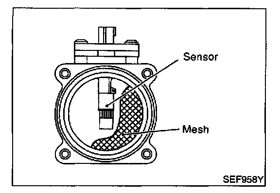 The mass air flow sensor is placed in the stream of intake air. It measures the intake flow rate by measuring a part of the entire intake flow. It consists of a hot film that is supplied with electric current from the ECM. The temperature of the hot film is controlled by the ECM a certain amount. The heat generated by the hot film is reduced as the intake air flows around it. The more air, the greater the heat loss.