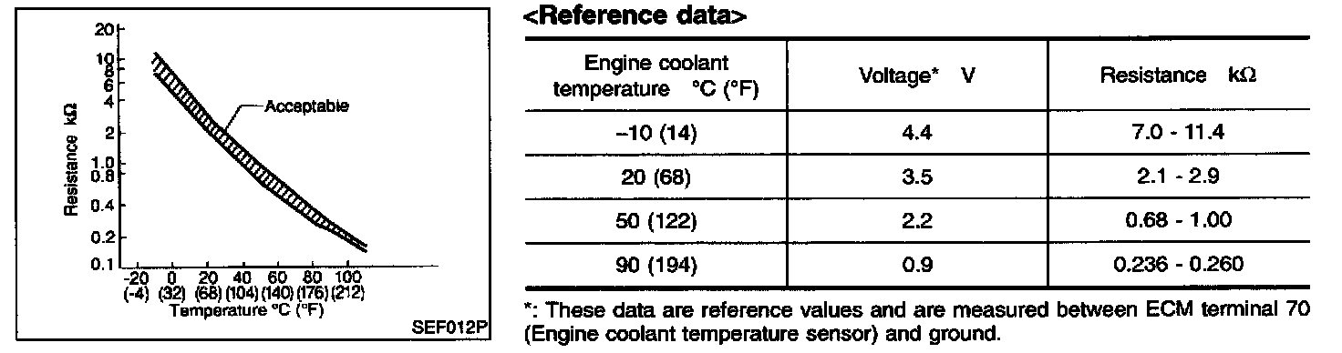 The engine coolant temperature sensor is used to detect the engine coolant temperature. The sensor modifies a voltage signal from the ECM. The modified signal returns to the ECM as the engine coolant temperature input. The sensor uses a thermistor which is sensitive to the change in temperature. The electrical resistance of the thermistor decreases as temperature increases.