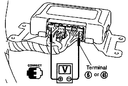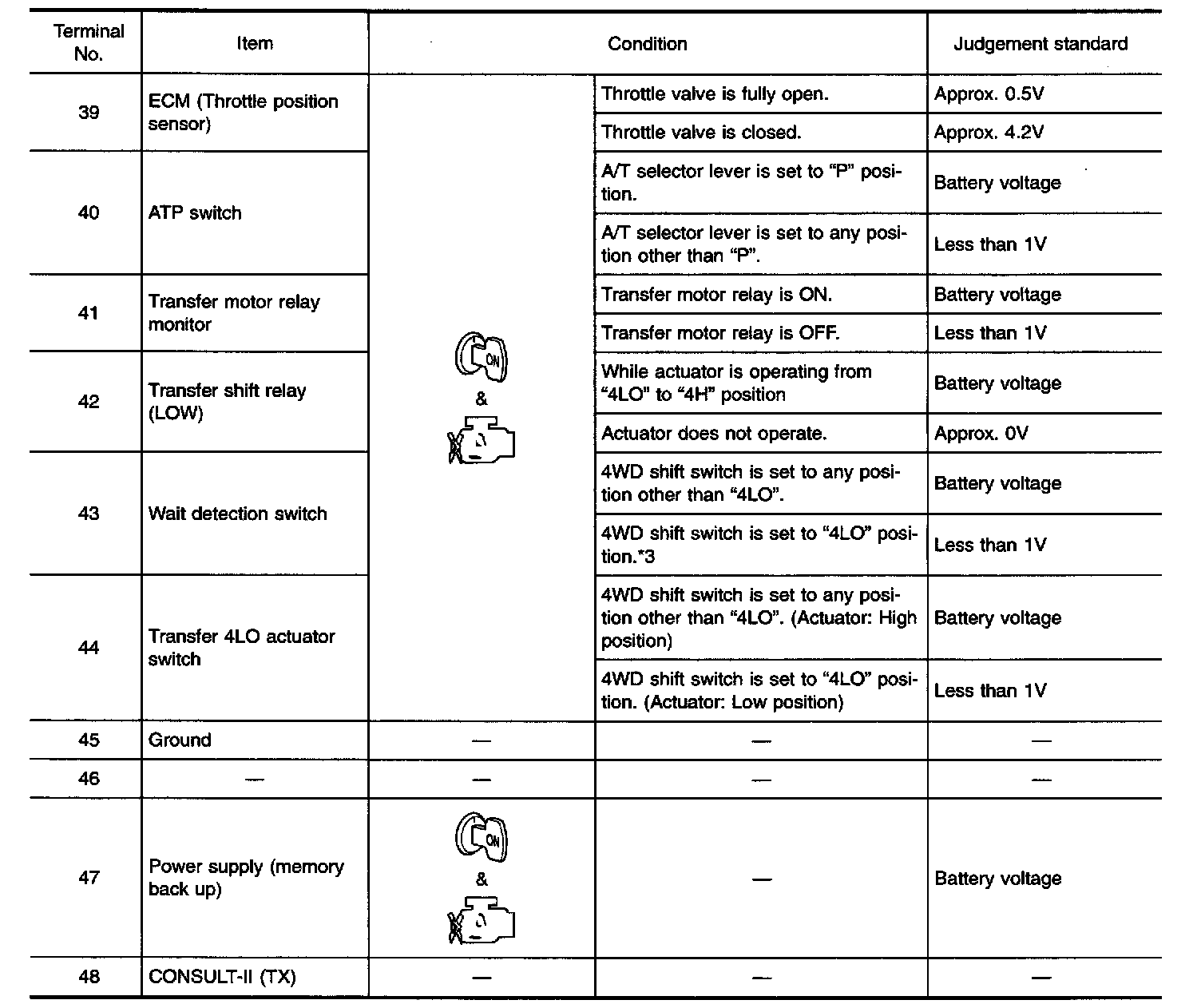 INSPECTION OF TRANSFER CONTROL UNIT- Measure voltage between each terminal and terminal 6 or 45 by following "TRANSFER CONTROL UNIT INSPECTION TABLE".