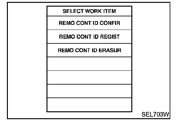 REMOTE CONTROLLER ID SET UP WITH CONSULT-IINOTE: If a remote controller is lost, the ID code of the lost remote controller must be erased to prevent unauthorized use. When the ID code of a lost remote controller is not known, all controller ID codes should be erased. After all ID codes are erased, the ID codes of all remaining and/or new remote controllers must be re-registered.