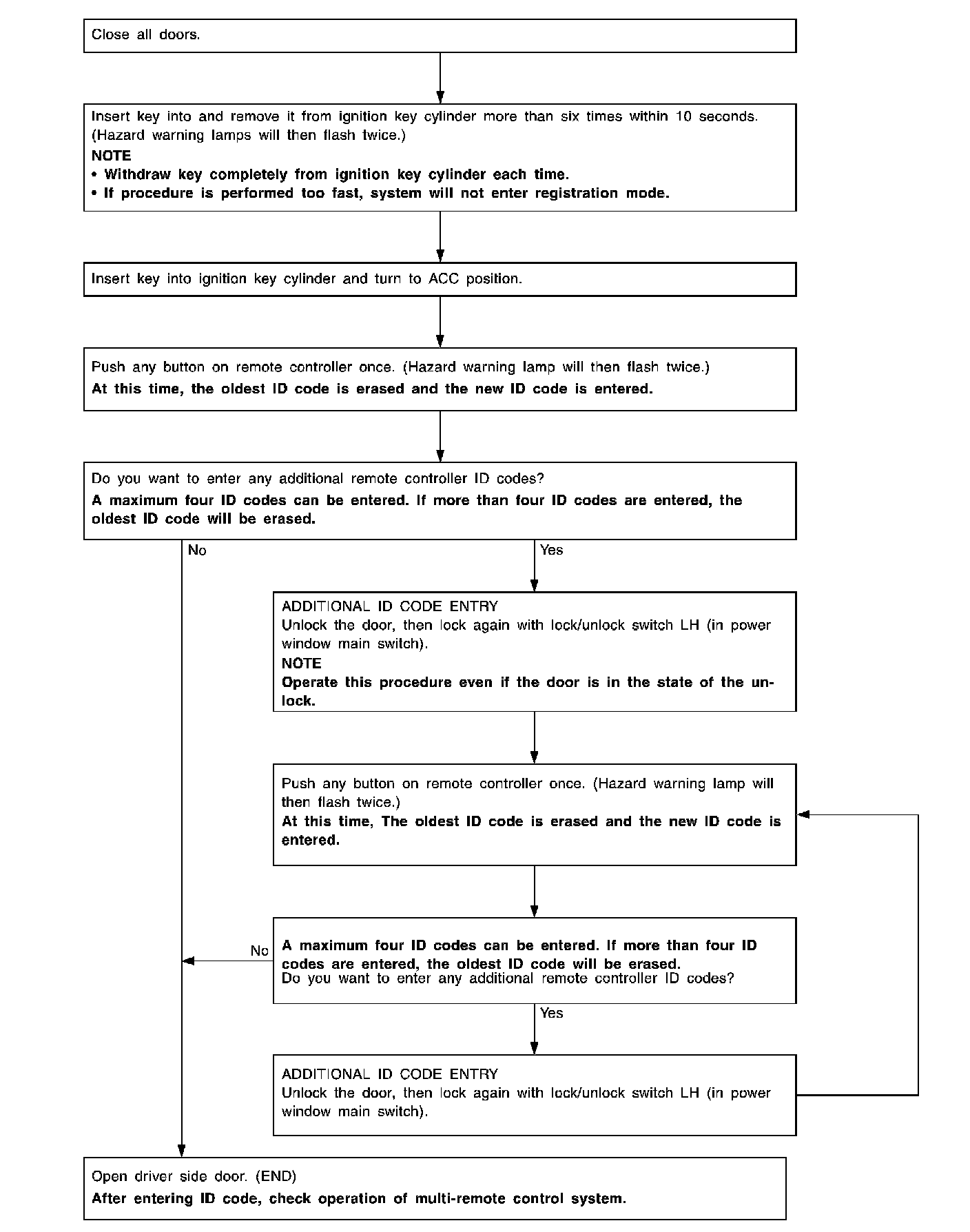 - When registering an additional remote controller, the existing ID codes in memory may or may not be erased. If four ID codes are stored in memory when an additional code is registered, only the oldest code is erased. If less than four ID codes are stored in memory, when an additional ID code is registered, the new ID code is added and no ID codes are erased.