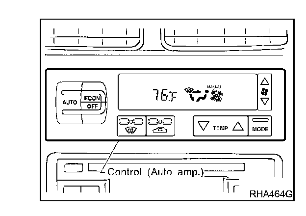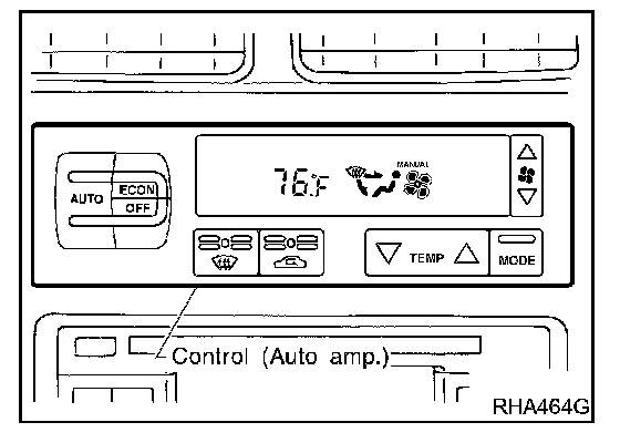 The PTC is built into the A/C auto amp. It can be set at an interval of 0.5 °C (1.0 °F) in the 18 °C (65 °F) to 32 °C (85 °F) temperature range by pushing the temperature button. The set temperature is digitally displayed.