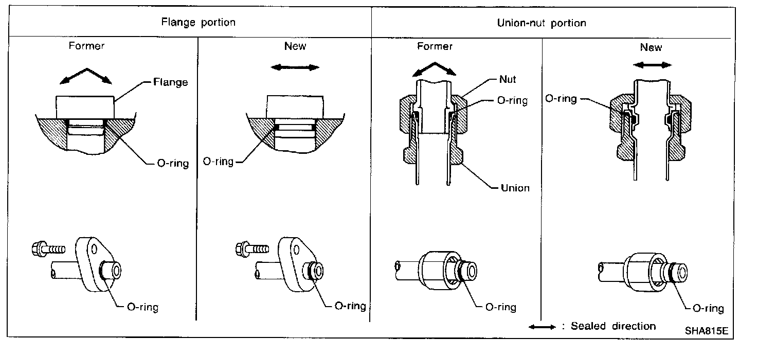 The O-ring has been relocated. It has also been provided with a groove for proper installation. This eliminates the chance of the O-ring being caught in, or damaged by, the mating part. The sealing direction of the O-ring is now set vertically in relation to the contacting surface of the mating part to improve sealing characteristics.