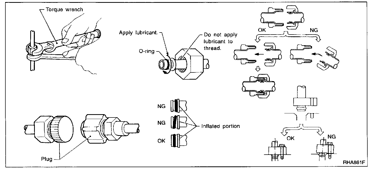 * After connecting line, conduct leak test and make sure that there is no leakage from connections. When the gas leaking point is found, disconnect that line and replace the O-ring. Then tighten connections of seal seat to the specified torque.