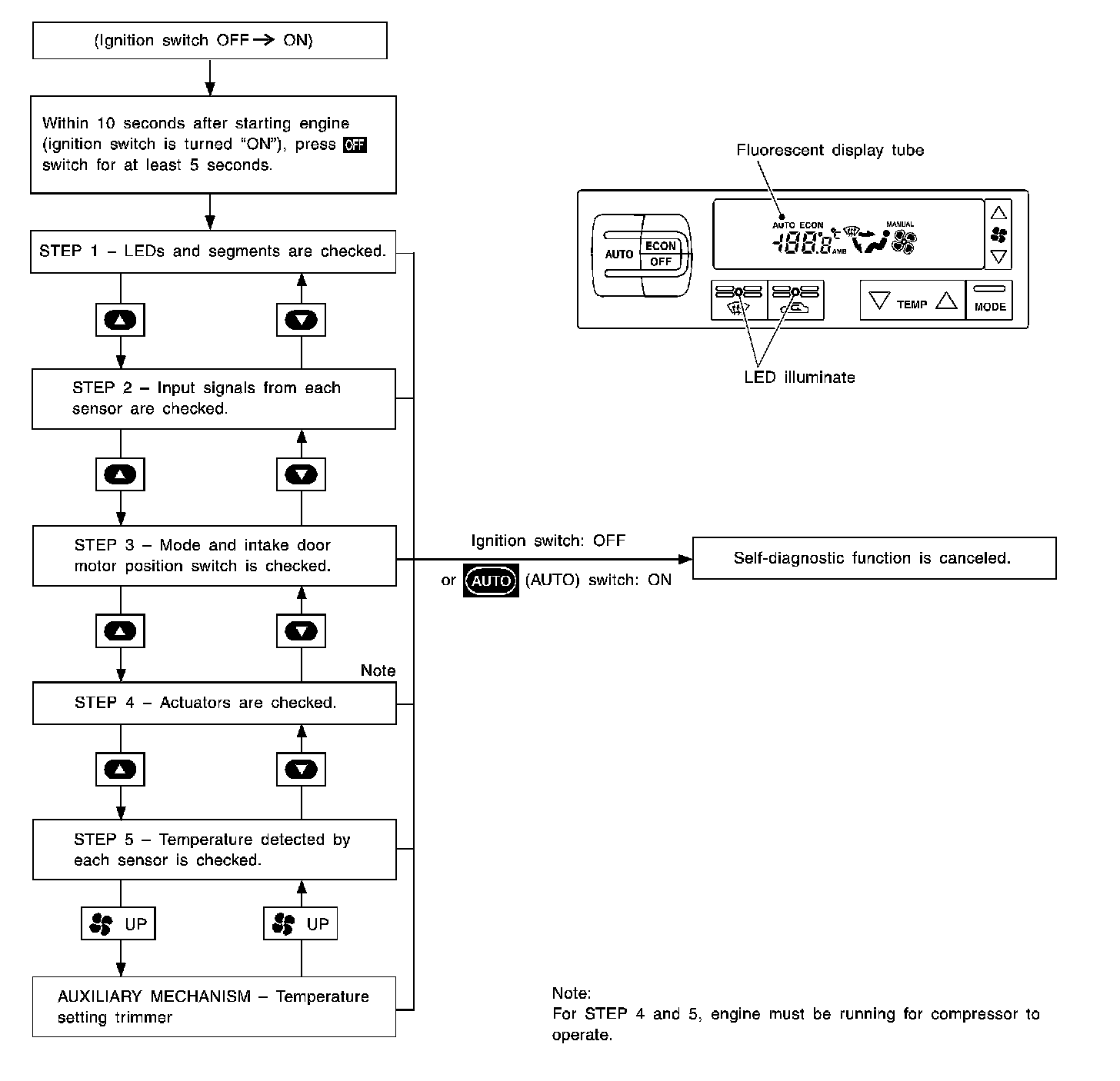 Shifting from normal control to the self-diagnostic system is accomplished by starting the engine (turning the ignition switch from "OFF" to "ON") and pressing "OFF" switch for at least 5 seconds.