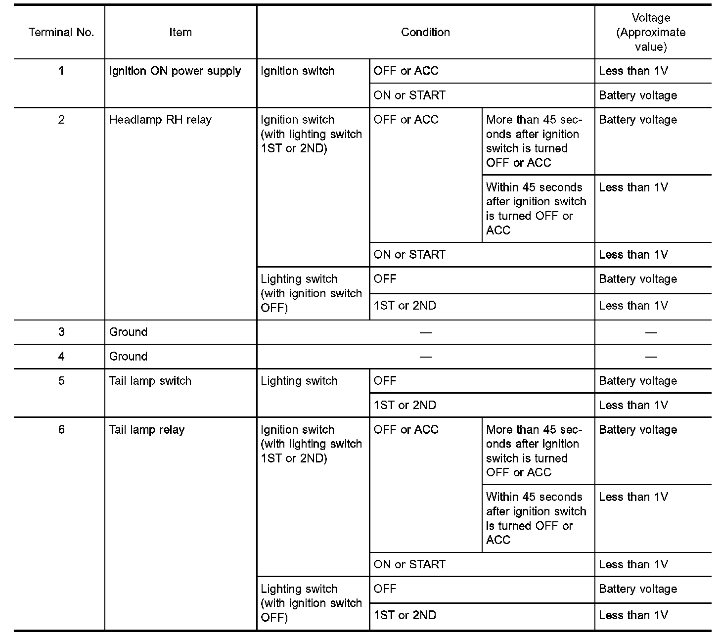 Battery Saver Control Unit Inspection Table (Terminal No. 1 - 6) (USA/CANADA):