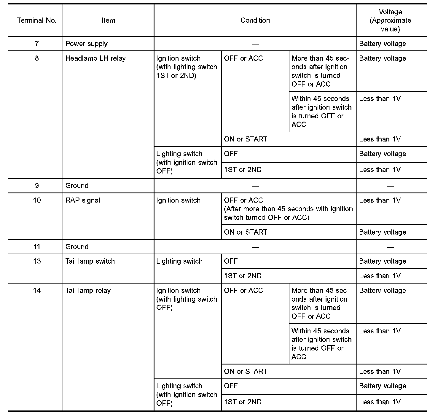 Battery Saver Control Unit Inspection Table (Terminal No. 7 - 14) (USA/CANADA):