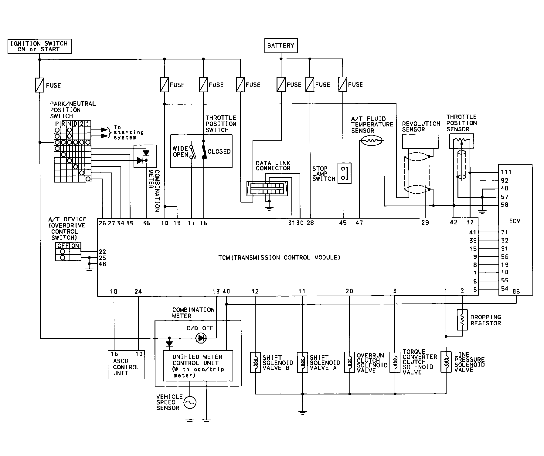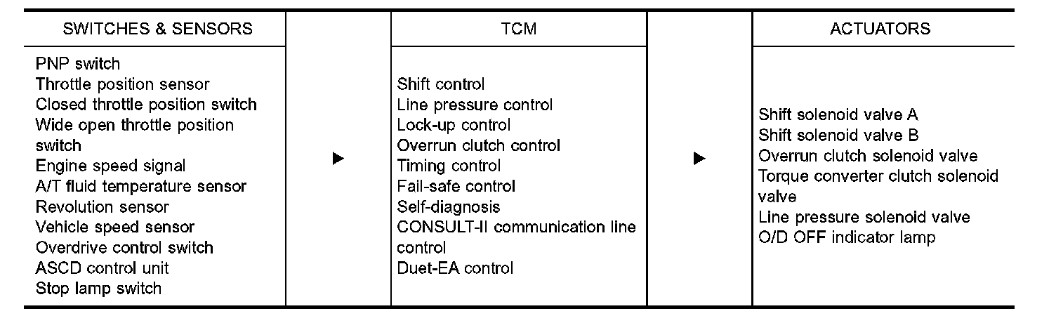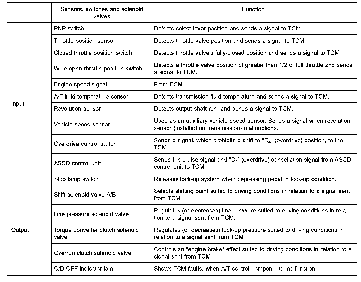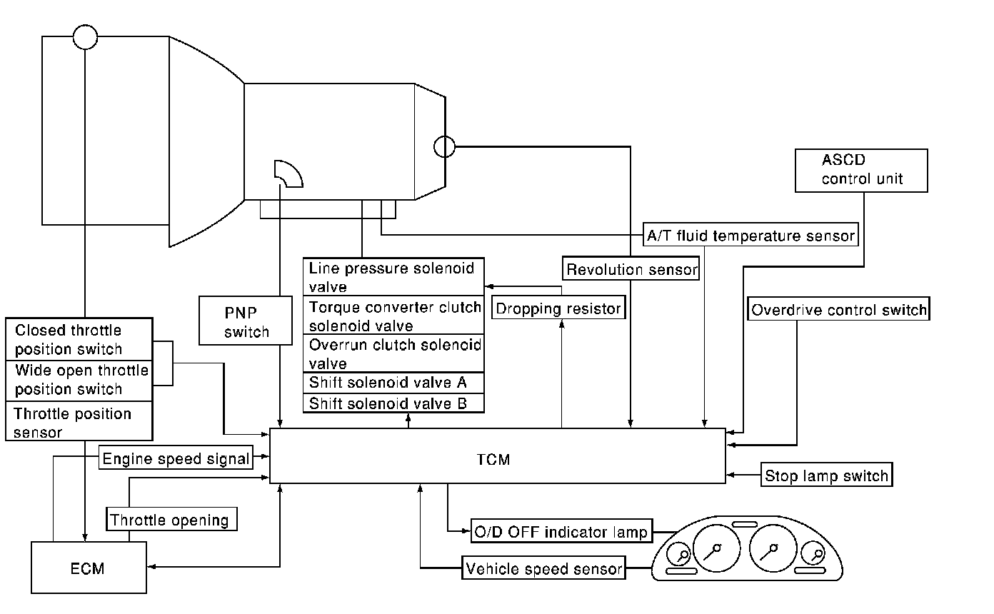 The TCM activates shift solenoid valves A and B according to signals from the throttle position sensor and revolution sensor to select the optimum gear position on the basis of the shift schedule memorized in the TCM.