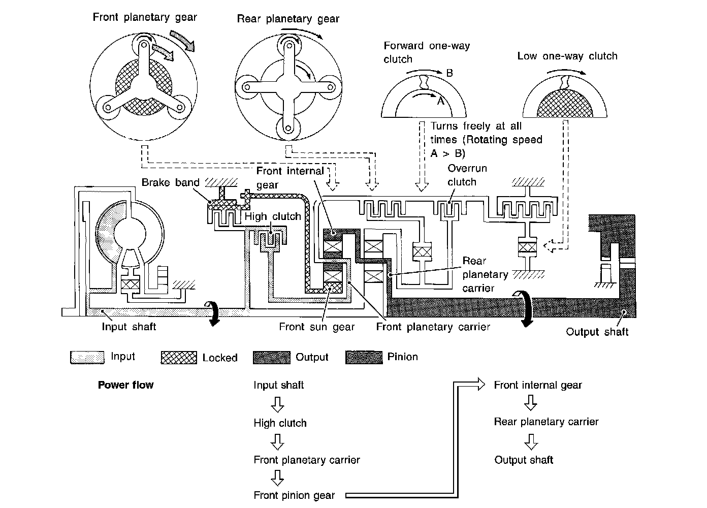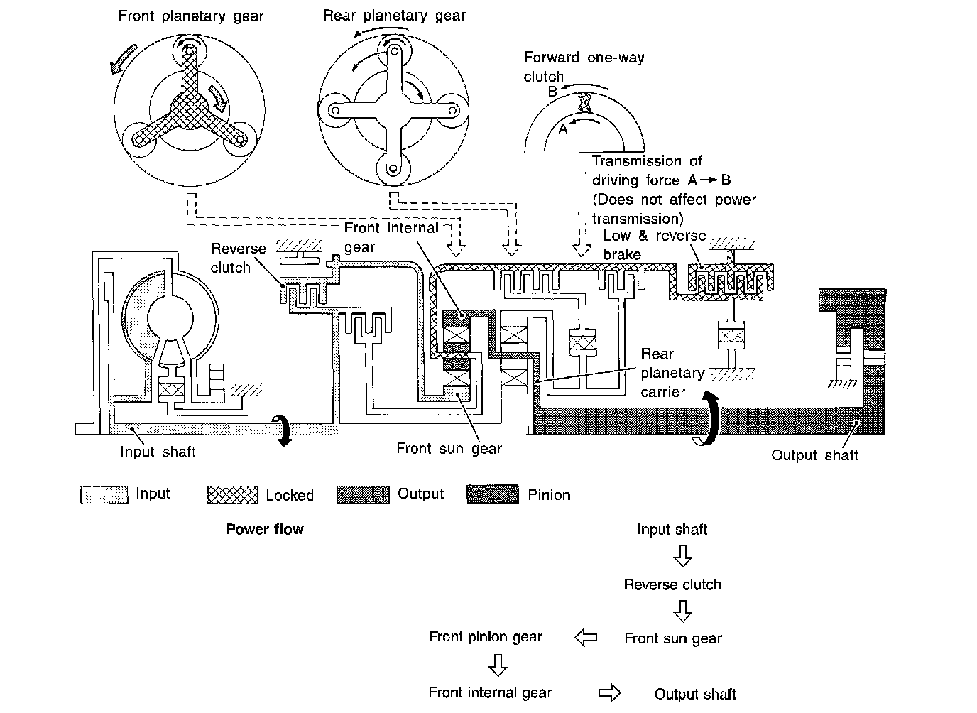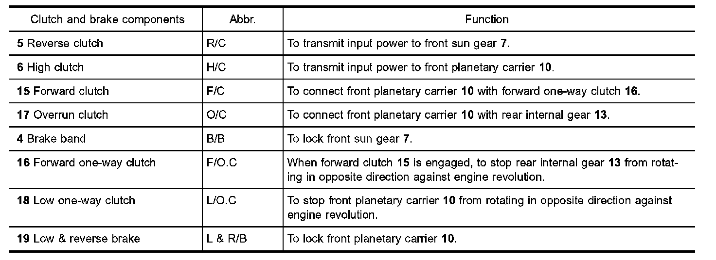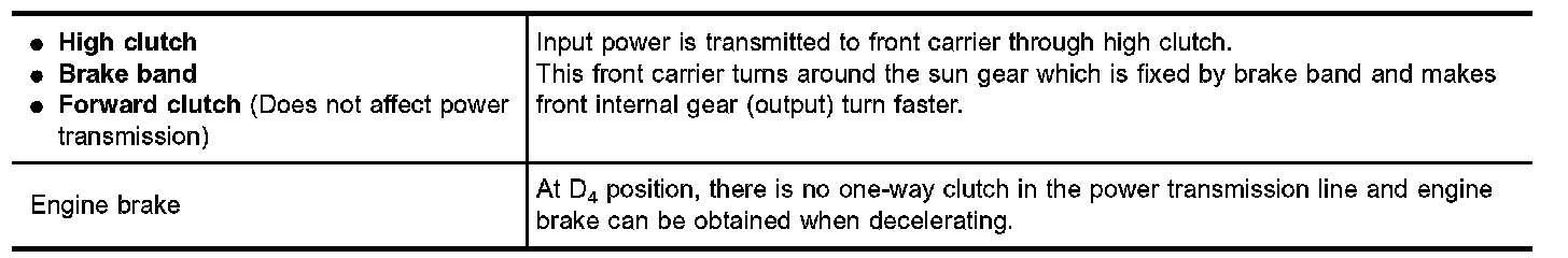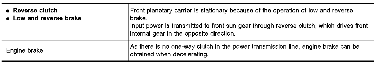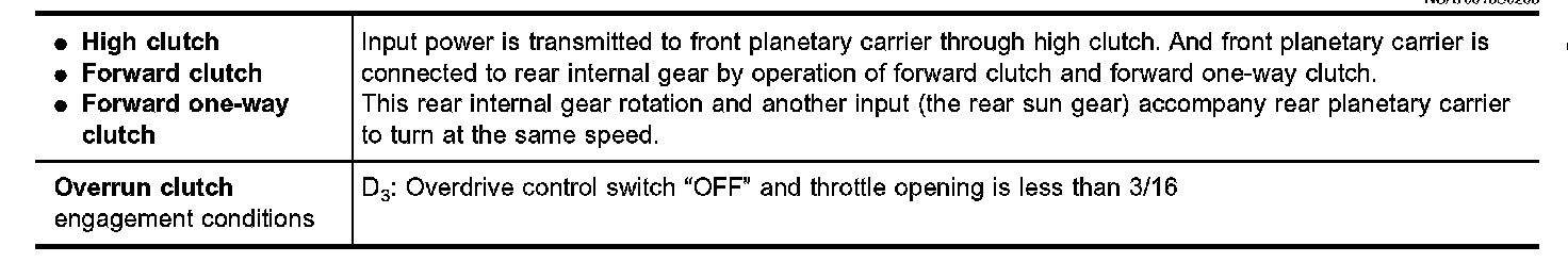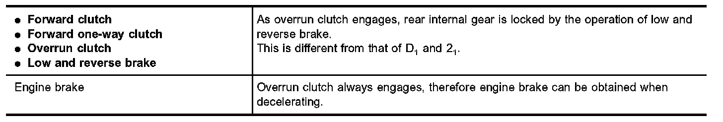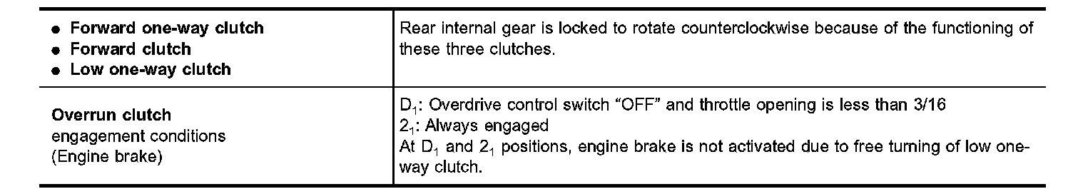 Forward one-way clutch is used to reduce shifting shocks in downshifting operations. This clutch transmits engine torque to the wheels. However, drive force from the wheels is not transmitted to the engine because the one-way clutch rotates idle. This means the engine brake is not effective.