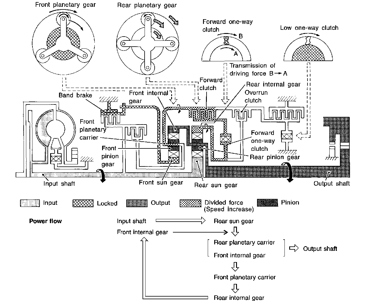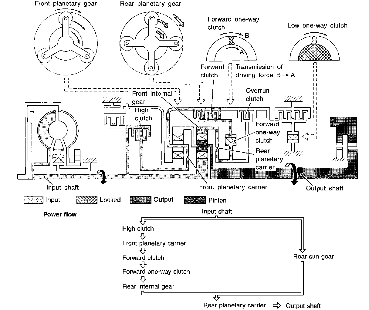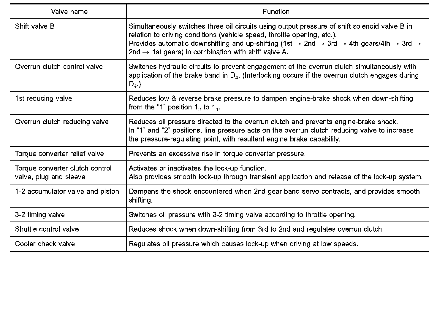 Forward one-way clutch is used to reduce shifting shocks in downshifting operations. This clutch transmits engine torque to the wheels. However, drive force from the wheels is not transmitted to the engine because the one-way clutch rotates idle. This means the engine brake is not effective.