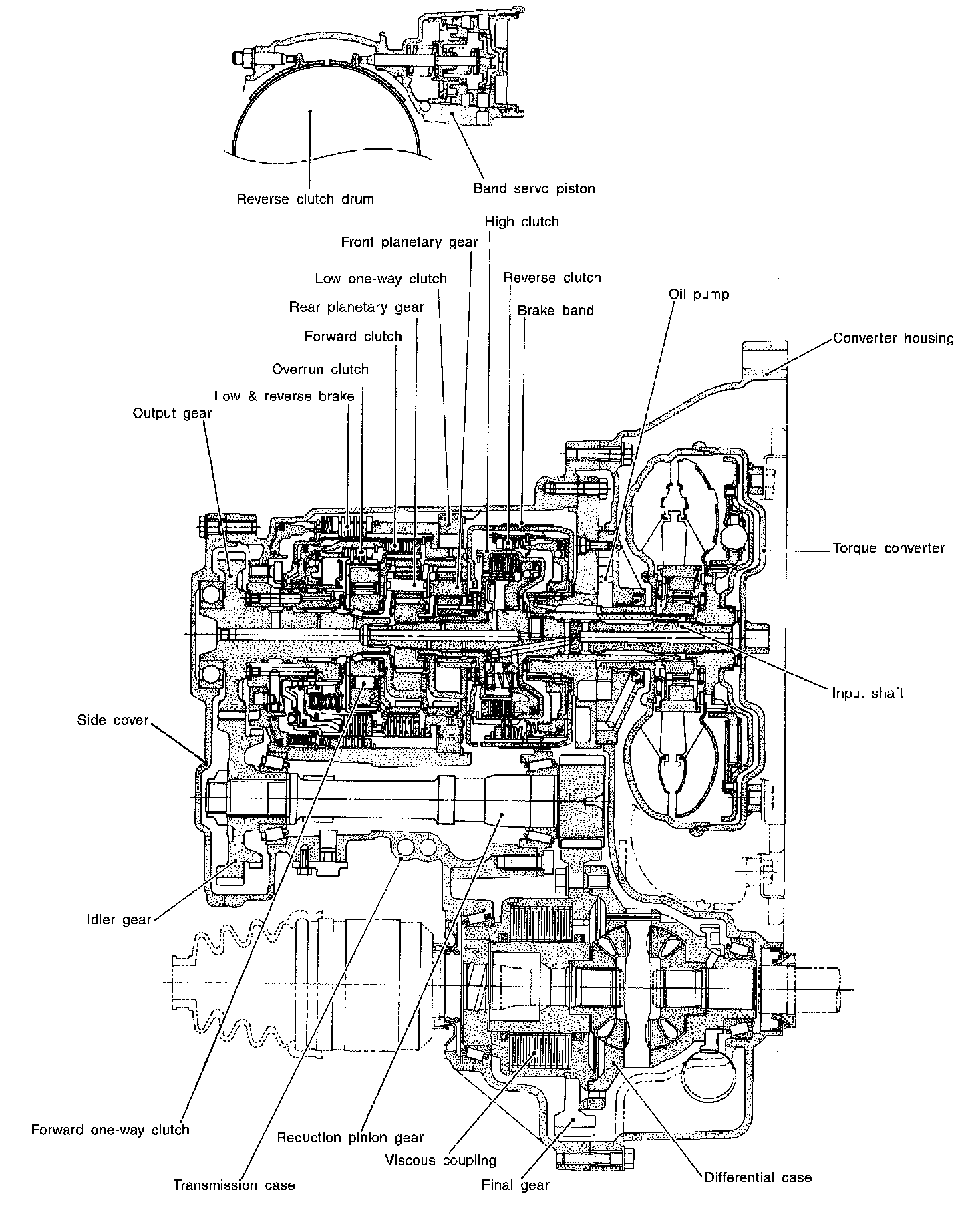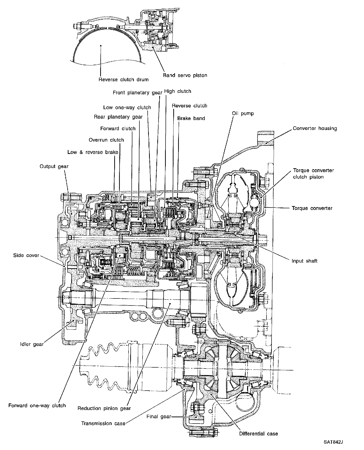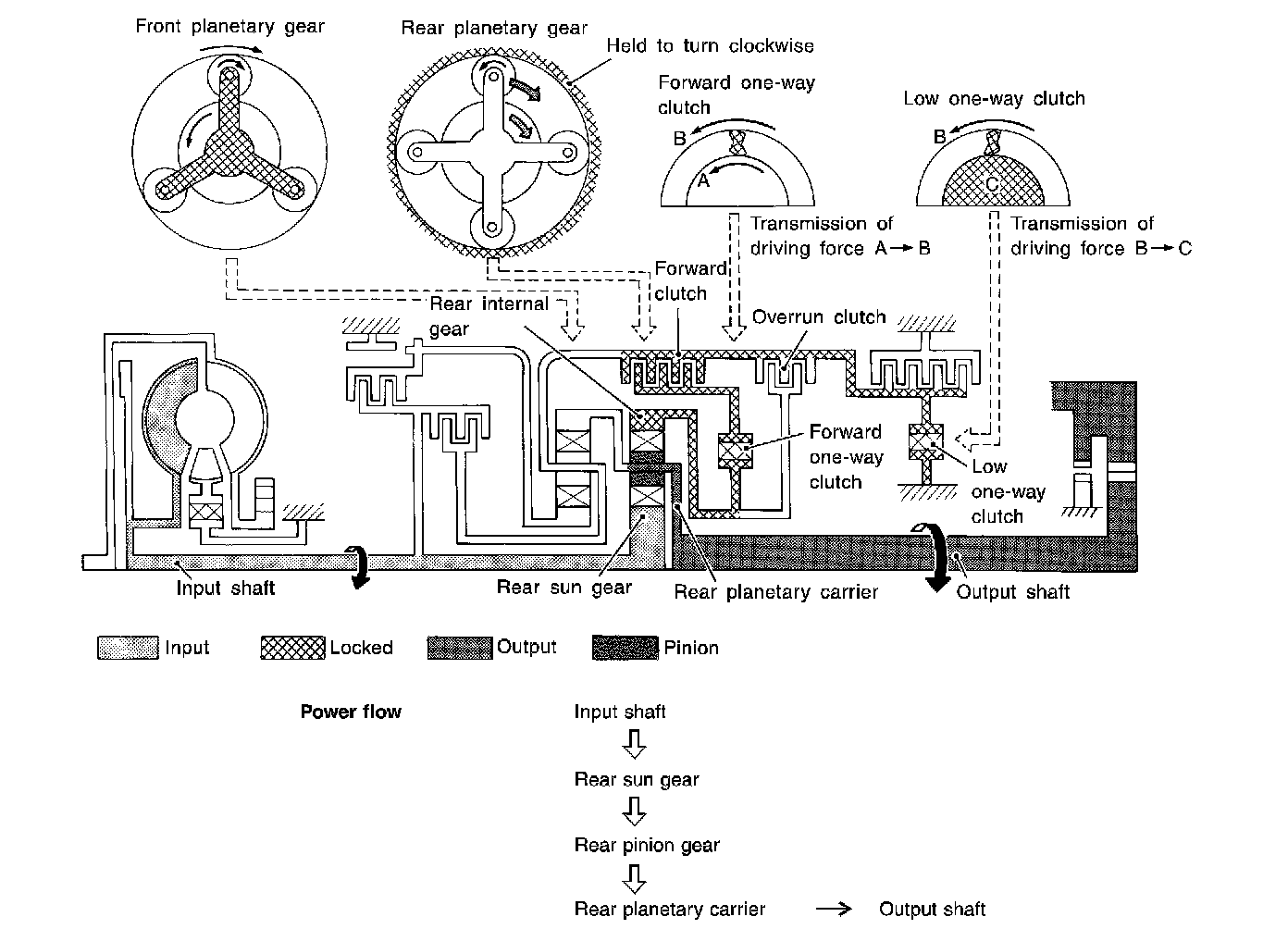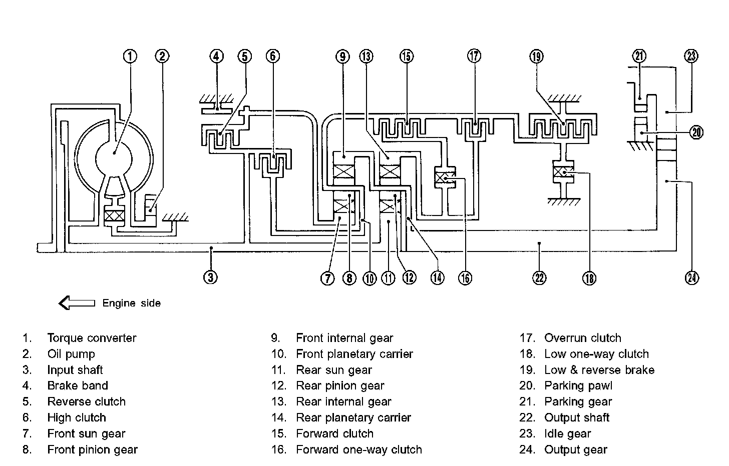 Forward one-way clutch is used to reduce shifting shocks in downshifting operations. This clutch transmits engine torque to the wheels. However, drive force from the wheels is not transmitted to the engine because the one-way clutch rotates idle. This means the engine brake is not effective.