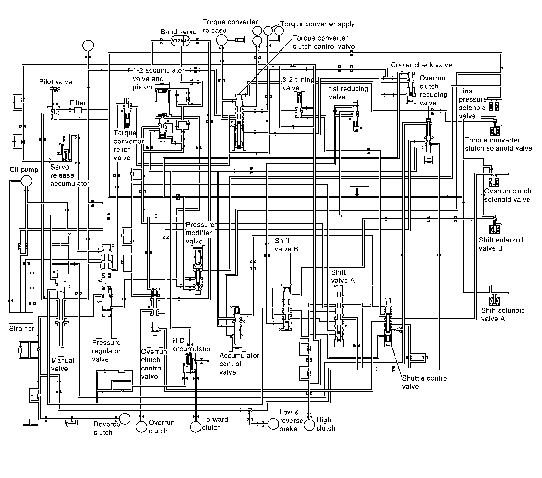 Hydraulic pressure on the clutch and brake is electronically controlled through the line pressure solenoid valve to accommodate engine torque. This results in smooth shift operation.