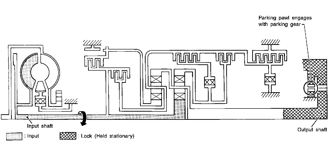 Similar to the "N" position, the clutches do not operate. The parking pawl engages with the parking gear to mechanically hold the output shaft so that the power train is locked.