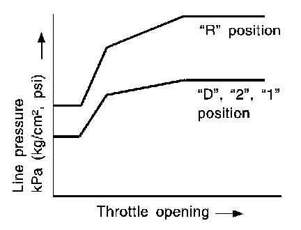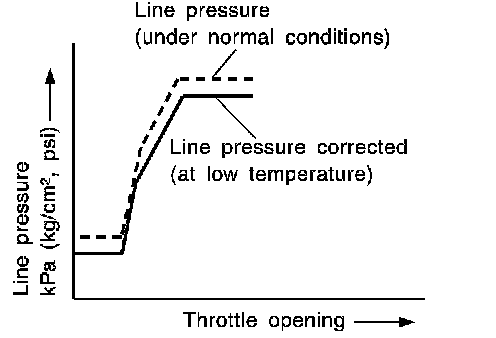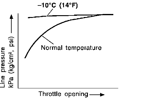 - Line pressure is increased to a maximum irrespective of the throttle opening when fluid temperature drops to -10°C (14°F). This pressure rise is adopted to prevent a delay in clutch and brake operation due to extreme drop of fluid viscosity at low temperature.