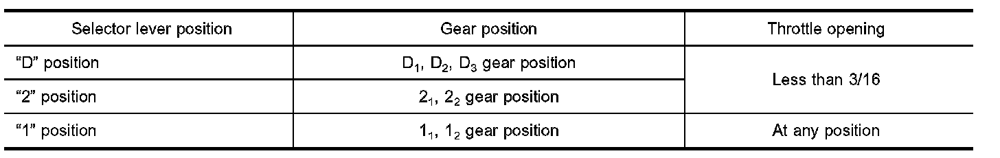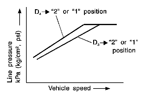 If the selector lever is shifted to "2" position while driving in D4 (OD) or D3, great driving force is applied to the clutch inside the transmission. Clutch operating pressure (line pressure) must be increased to deal with this driving force.
