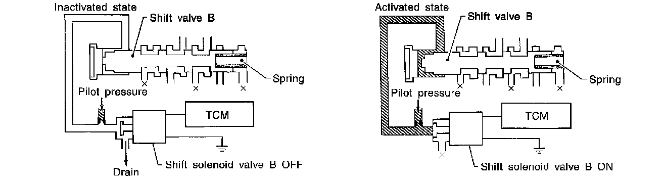 The shift solenoid valve performs simple ON-OFF operation. When set to "ON", the drain circuit closes and pilot pressure is applied to the shift valve.