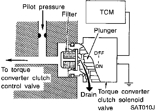 The torque converter clutch solenoid valve is controlled by the TCM. The plunger closes the drain circuit during the "OFF" period, and opens the circuit during the "ON" period. If the percentage of OFF-time increases in one cycle, the pilot pressure drain time is reduced and pilot pressure remains high.