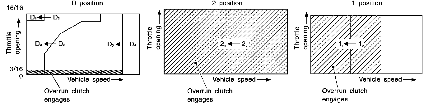 The shift is regulated entirely by electronic control to accommodate vehicle speed and varying engine operations. This is accomplished by electrical signals transmitted by the revolution sensor and throttle position sensor. This results in improved acceleration performance and fuel economy.