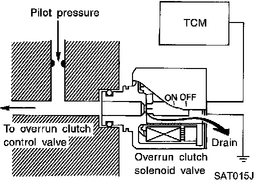 The overrun clutch solenoid valve is operated by an ON-OFF signal transmitted by the TCM to provide overrun clutch control (engine brake control). When this solenoid valve is "ON", the pilot pressure drain port closes. When it is "OFF", the drain port opens. During the solenoid valve "ON" pilot pressure is applied to the end face of the overrun clutch control valve.