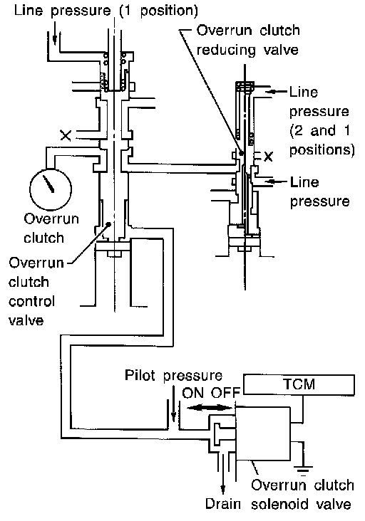 When the solenoid valve is "ON", pilot pressure is applied to the overrun clutch control valve. This pushes up the overrun clutch control valve. The line pressure is then shut off so that the clutch does not engage.