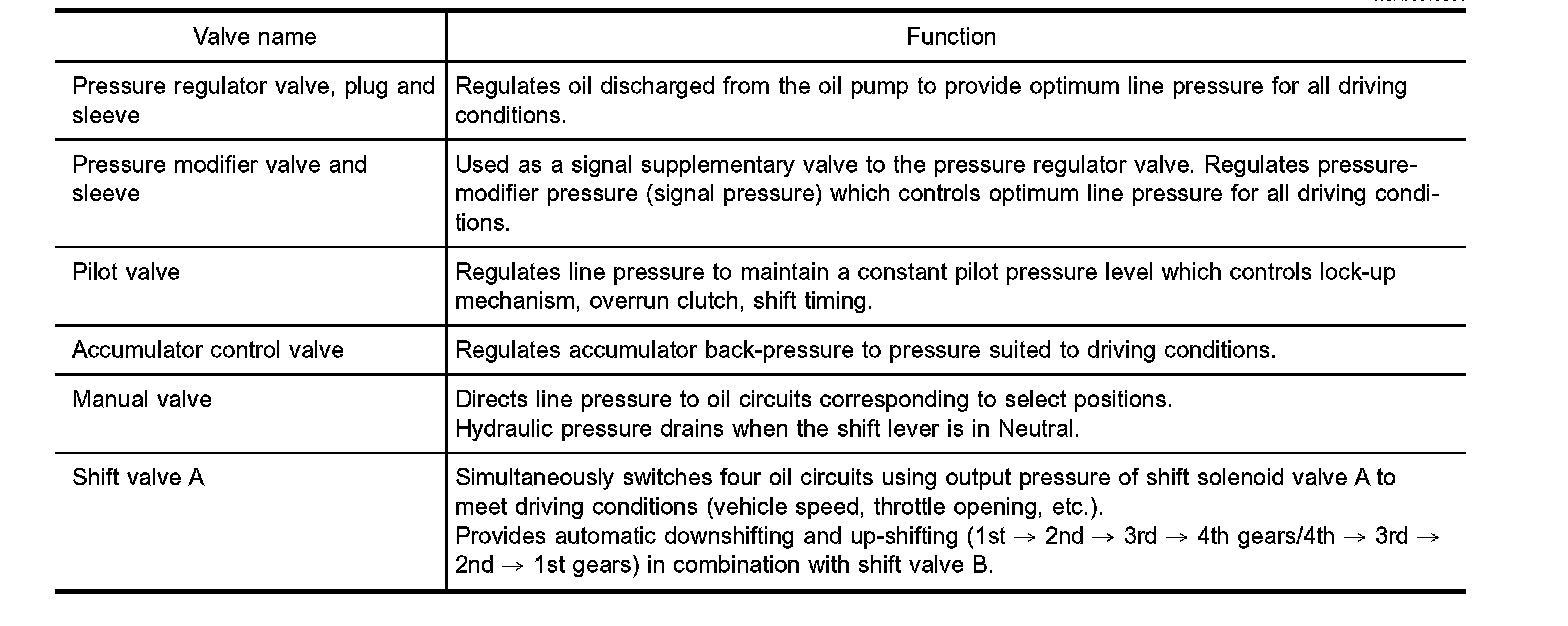 The torque converter clutch piston in the torque converter is locked to eliminate torque converter slip to increase power transmission efficiency. The solenoid valve is controlled by an ON-OFF duty signal sent from the TCM. The signal is converted to an oil pressure signal, which controls the torque converter clutch piston.