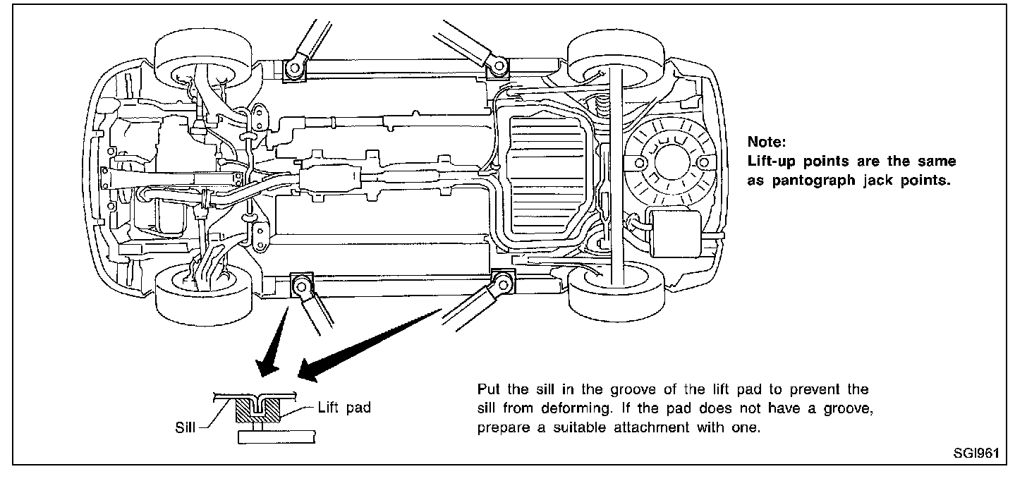 When lifting the vehicle, open the lift arms as wide as possible and ensure that the front and rear of the vehicle are well balanced.