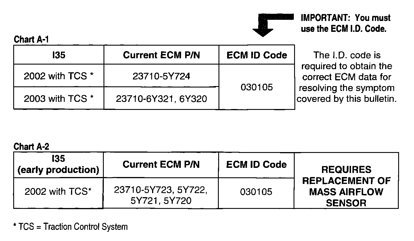 ^ Perform ECM Reprogramming. This is required if the ECM Part Number (P/N) in the vehicle matches one of those listed under "Current ECM P/N" in Chart A-1 or A-2.