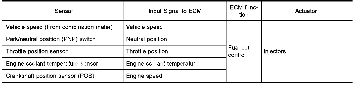 If the engine speed is above 1,800 rpm with no load (for example, in neutral and engine speed over 1,800 rpm) fuel will be cut off after some time. The exact time when the fuel is cut off varies based on engine speed. Fuel cut will operate until the engine speed reaches 1,500 rpm, then fuel cut is cancelled.
