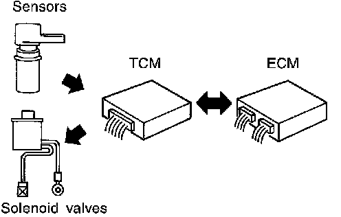 The TCM also communicates with the ECM by means of a signal sent from sensing elements used with the OBD-related parts of the A/T system for malfunction-diagnostic purposes. The TCM is capable of diagnosing malfunctioning parts while the ECM can store malfunctions in its memory.