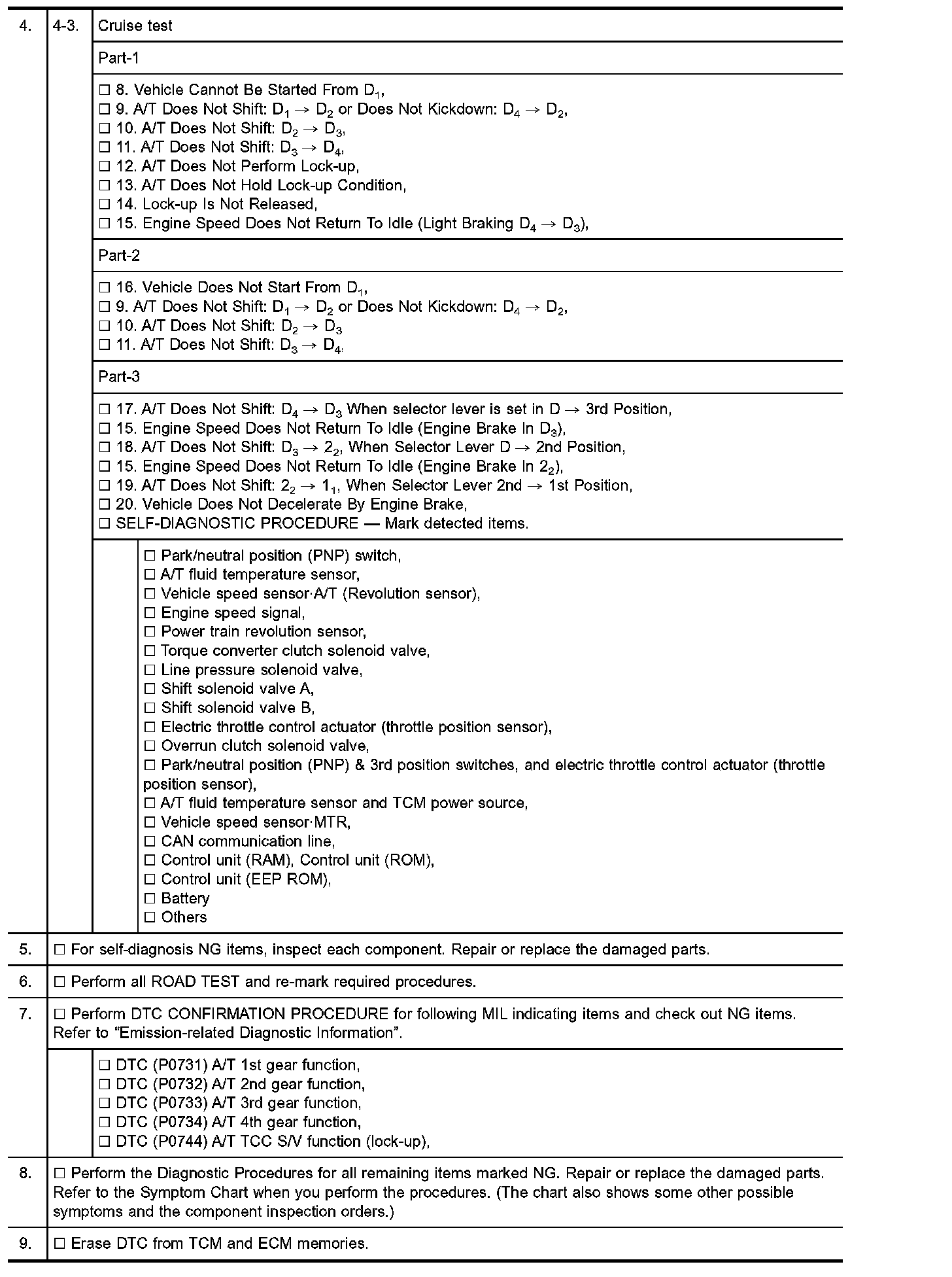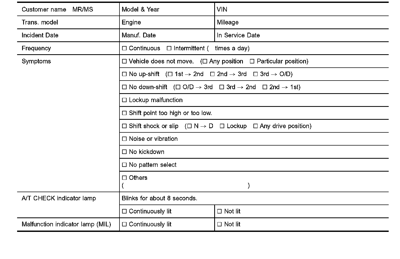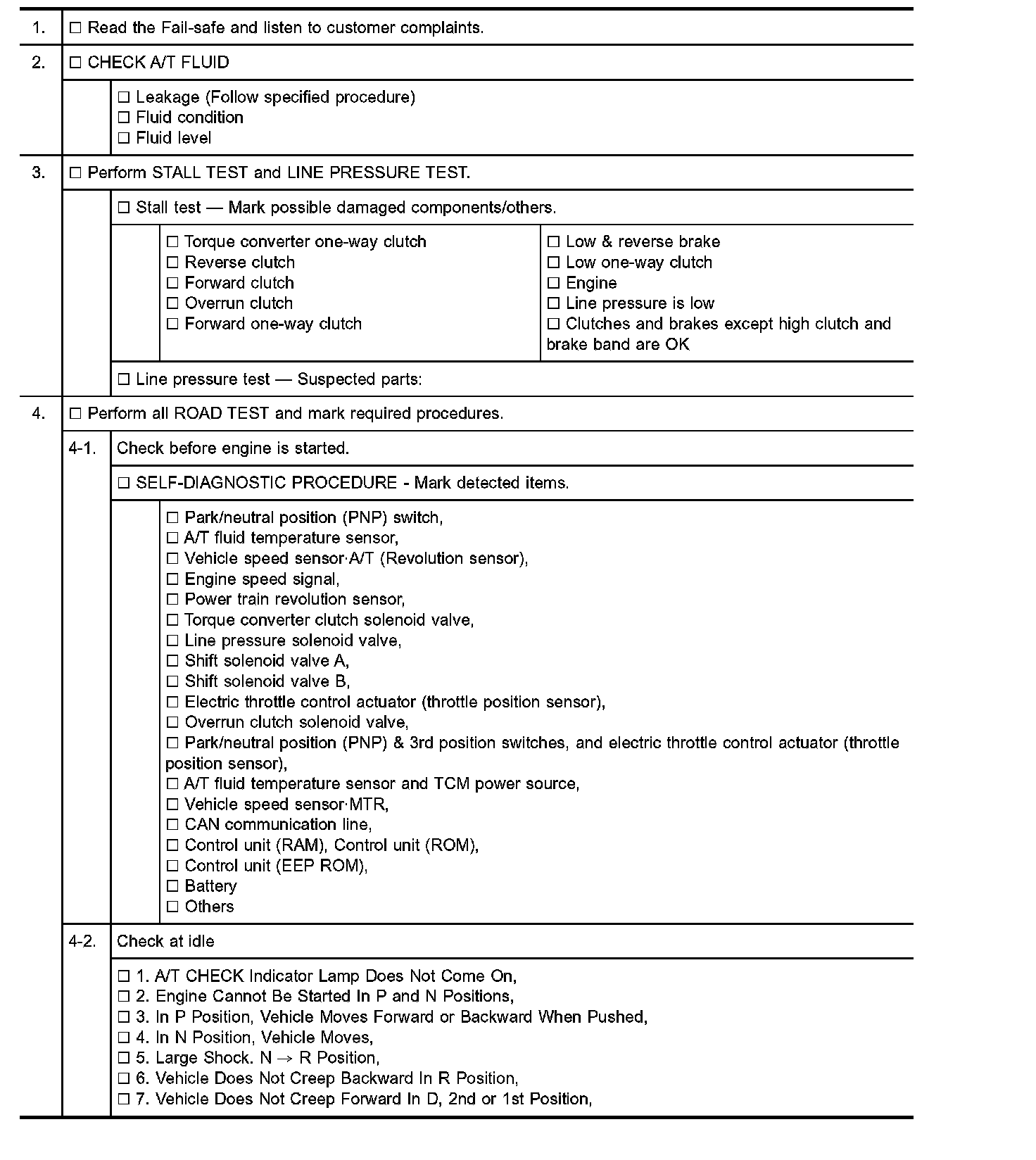 Input and output signals must always be correct and stable in the operation of the A/T system. The A/T system must be in good operating condition and be free of valve seizure, solenoid valve malfunction, etc.