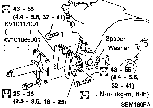 Tighten all bolts to 32 to 38 Nm (3.3 to 3.9 kg-m, 24 to 28 ft. lbs.).