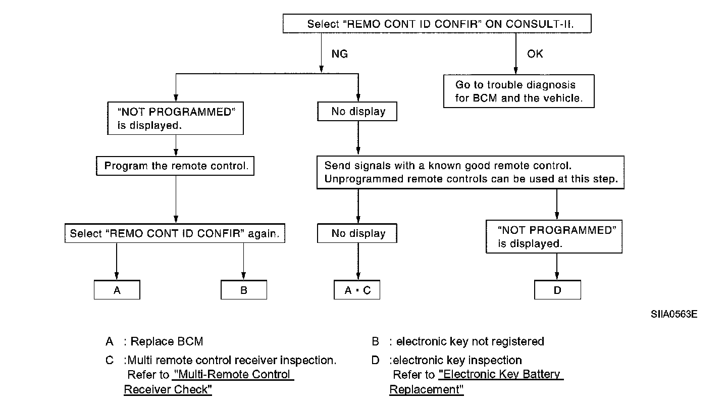 - When the Remote Keyless Entry System is malfunctioning, determine which part has caused the incident, before carrying out the trouble diagnosis.- Using the following diagnosis flowchart, determine whether the electronic key or the vehicle component (multi remote control receiver or BCM) has a malfunction and confirm the part to be checked.